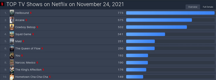 11月24日的Netflix剧集收视榜,《地狱公使》遥遥领先。