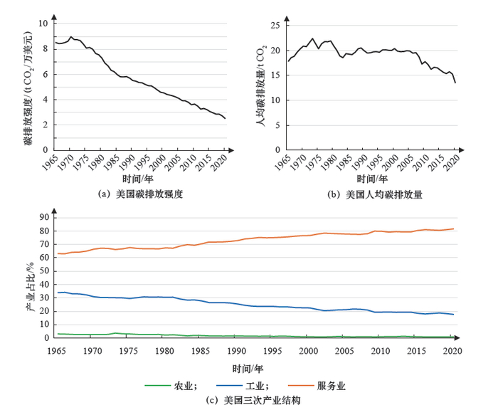 图 5 美国三次产业结构、碳排放强度、人均碳排放量的变化趋势(1965—2020 年)