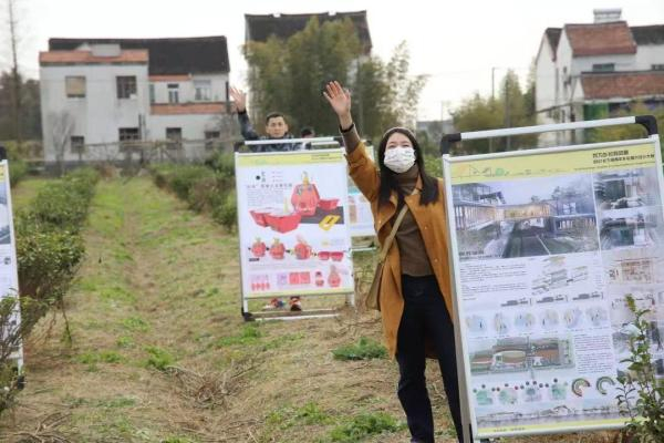 在当天的巡展过程中,前来观展的乡亲们对于涉及自己生活空间的设计尤其感兴趣,也问得特别详细。一位阿姨就指着展板上兴豪路公园的设计方案问:“这能做什么?里头有什么?”设计者在旁一一解答。来自东华大学的马铭骏,此次为朱枫公路与亭枫公路口的沪浙边界设计了一个景观装置《且听‘枫’吟》,他很关心方案与环境是否契合、是否影响交通、居民们观感如何。因为自家产品被列入了设计选题,沪枫茶园的负责人还找到设计者直话直说地反馈意见:“现在这个作品风格太商务化了,我们想要田园、清新的感觉,同时也更吸引年轻人的设计。”