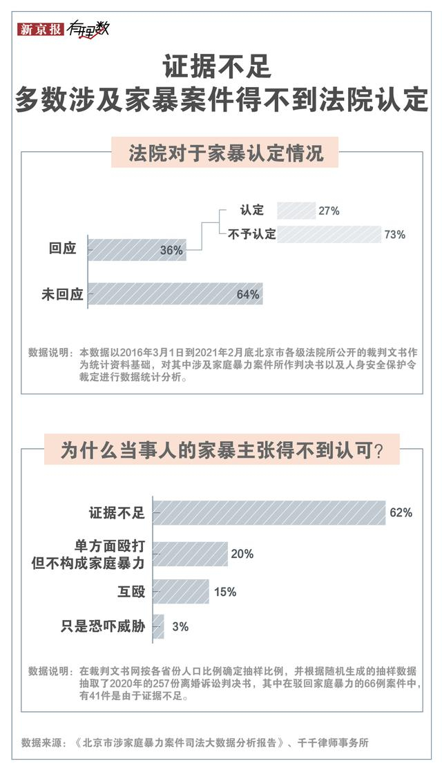 以北京市为例,《北京市涉家庭暴力案件司法大数据分析报告》显示,2016年3月到 2021年2月的五年时间内,北京地区涉家暴判决总数为320份,年均案件量为64件。