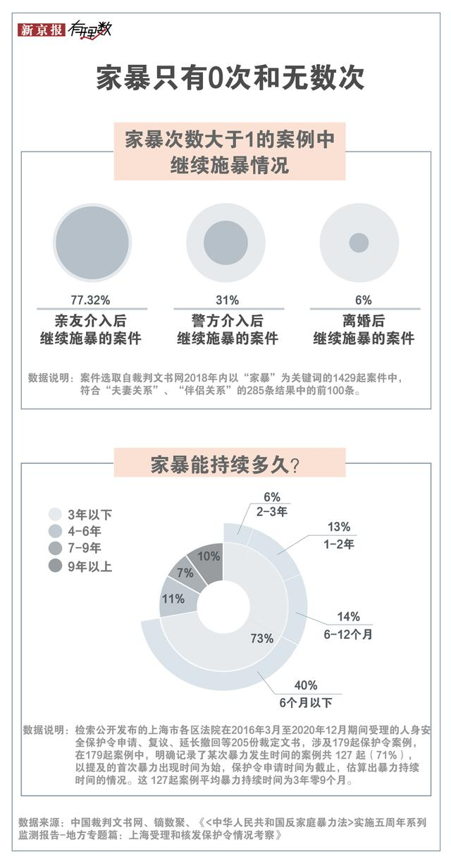 《上海受理和核发保护令情况考察》报告里显示,在其监测的179起案例中,明确记录了某次暴力发生时间的案例共127起,平均暴力持续事件为3年零9个月。