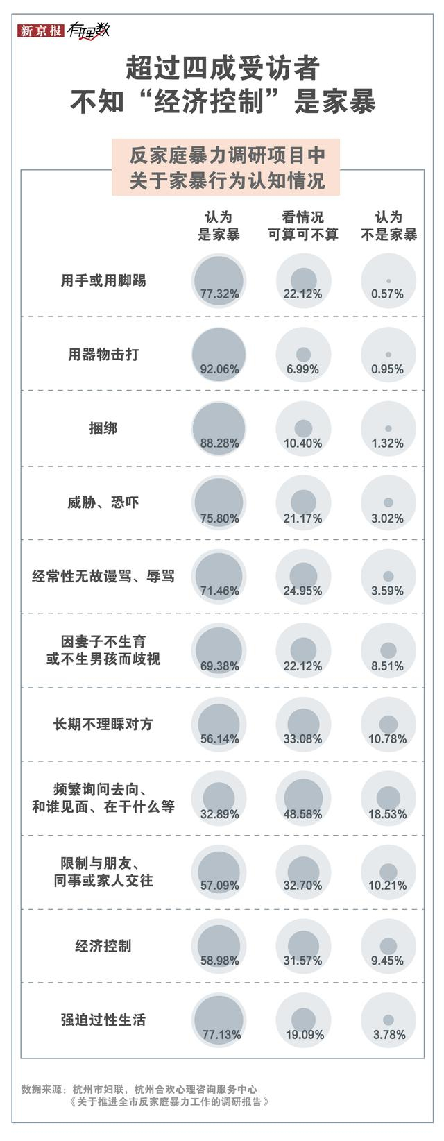 2018年杭州妇联一项关于居民对家暴行为认知调查显示,大部分人对行为暴力、精神暴力和性暴力等的认知态度较为统一,但对于经济控制、行为控制、冷暴力等行为认知不足,对家庭暴力的前期征兆以及其他形式的了解远远不够。