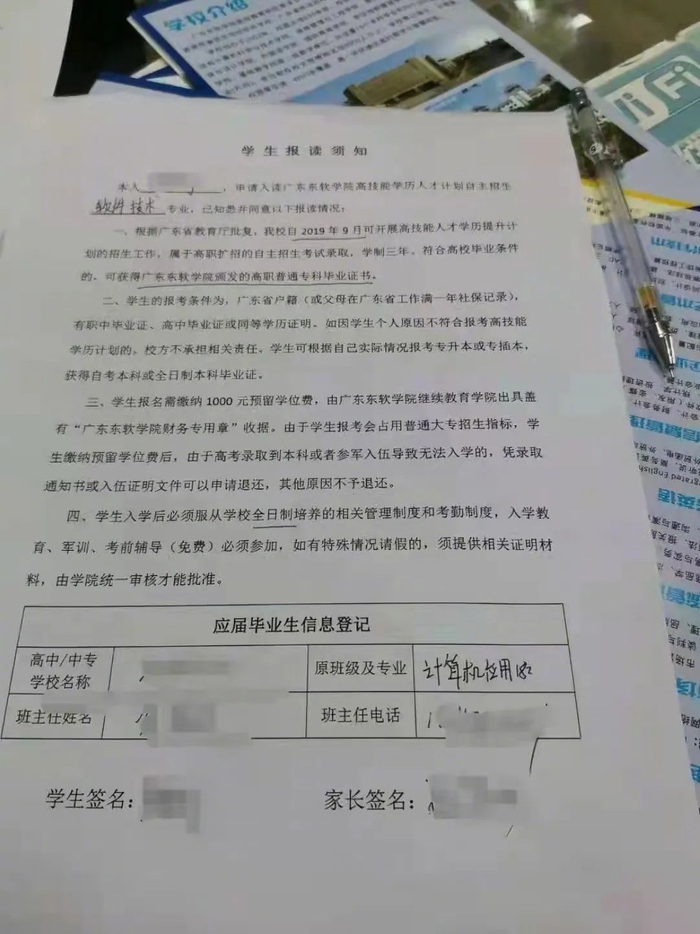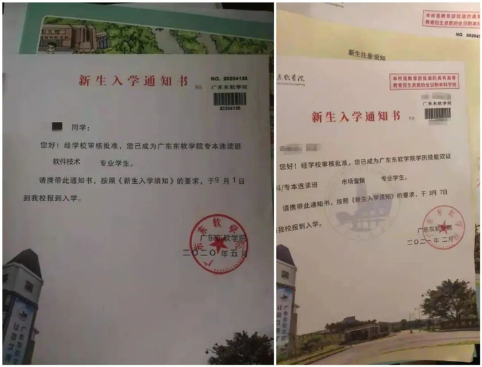 受访者提供的广东东软学院录取通知书(央广网发 受访者供图)“当时有的同学中专快毕业了,有的还得一年毕业,不清楚学校怎么获取了我们的联系方式,当时几乎挨个给我和同学打了电话。”小成说,据他了解,三年加起来没学籍拿不到全日制毕业证的学生有好几百人。
