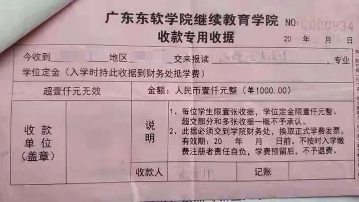 “当时我正在读一所中专未毕业,广东东软学院说这个没关系,先报名进去,等2021年拿到中专毕业证后,再参加2021级招考考试即可。”小成说,在该招生老师的承诺下,他按照要求先交了1000元名额预订费,随后按照学校通知的报名程序完成报名。约一周后便收到了来自广东东软学院的录取通知书,后向学校补交2020年度学杂费共计近两万元。然而,一年过去,2021年9月,小成突然被告知因学籍名额不够,自己无学籍将无法取得广东东软学院的全日制大专毕业证。