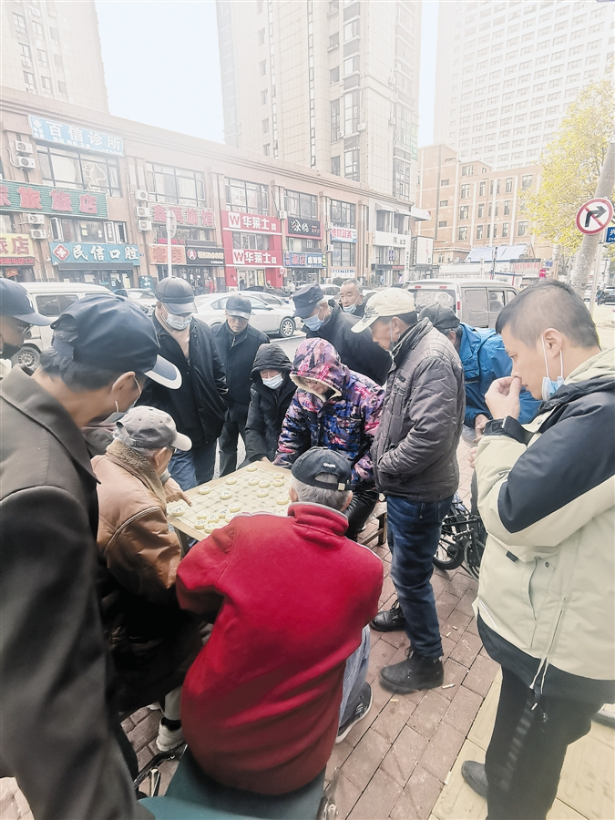 部分市民对于“不聚集”这一要求有所懈怠。在兴工北三街路旁人行道上记者看到,此处摆了一张桌子,上铺象棋盘,两位市民正“杀”得难解难分,而记者仔细一数,四周竟聚集了12名围观者。其中,包括下棋者在内,至少有6人的口罩没有佩戴好,不是露着鼻子,就是口鼻皆现。这还不算,有两三位还正口沫横飞地“指点江山”……