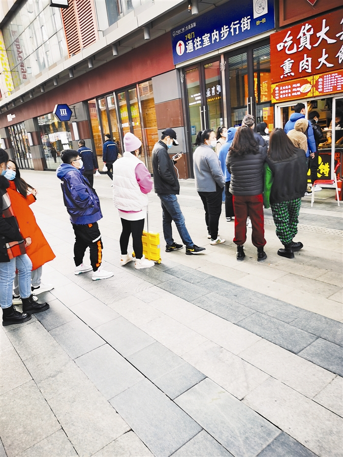 在高新金街的连丹熏肉大饼、小红旗臭豆腐、小李子锅盔等小吃档口前,记者看到食客大排长队、扎堆儿等餐、进食等现象,并未守住“一米线”。
