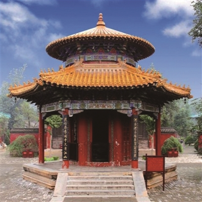 在河南省武陟县城东南、黄河下游北岸不远处,有一个占地140余亩、红墙蓝瓦的古建筑群。它是清雍正皇帝为祭祀河神、封赏历代治河功臣而特下诏书建造的集宫、庙、衙为一体的庙观,其正式名称叫作“嘉应观”。最令人瞩目的是进门后迎面的御碑亭,亭子正面迎门的柱子上,黑底金字书写有一副楹联,道:“河涨河落,维系皇冠顶戴;民心泰否,关乎大清江山”。