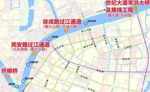 民安路过江通道(大庆南路-曙光北路):连接江北与鄞州,跨甬江桥梁一座,全长1500米,宽44米。