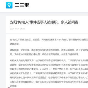 华商报-二三里客户端消息,安阳狗咬人事件,终于有了问责。这个问责没有“止于道歉”,当地4单位7干部受到处理。
