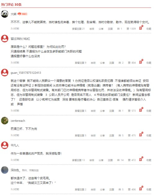 “就这个破事,就不能给人民群众一个满意的答复。”有网友提出自己的诸多疑问:办狗证是否以权谋私?安阳还有没有这种证;新冠防疫期间从政府单位能冲出伸缩棍(就是凶器)携带者,贴有警用标志,但为非警用制式装备说明了什么;“通报”中为什么全部是结果?那么这些被问责的人,究竟是因失了什么职、犯了什么错才被问责?伸缩棍被收缴了,但拿棍的人到底是谁派去的,又该担何责?小莉曾小声跟同事说,有人威胁要拿枪崩了她,是真的还是假的?若是真的,是谁威胁的?这种没有公布过程只公布结果的“通报”,被处理者本人服吗?社会公众服吗?对王新刚的处理是不是最终“处理结果”?对李小迎涉嫌诈骗问题,原办案人员是否该回避?