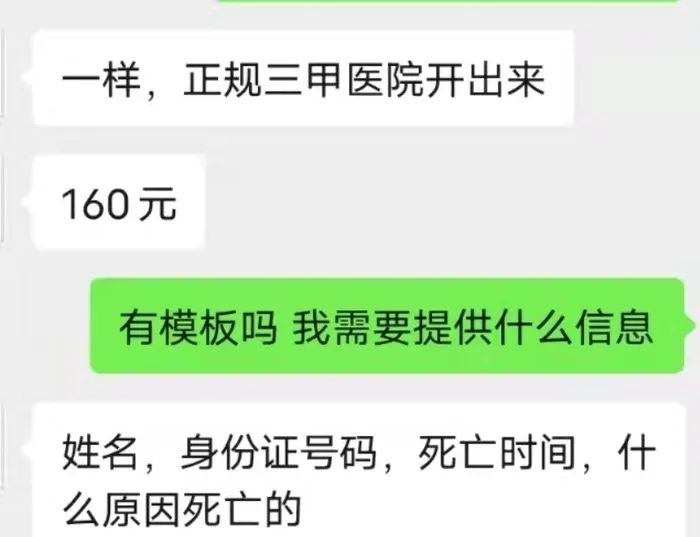 另一名商家表示,全国各地医院的死亡证明都可以开具。“正规三甲医院开出来的要160元,需要姓名、身份证号码、死亡时间、什么原因死的。”该商家表示,自己在医院有正规渠道。