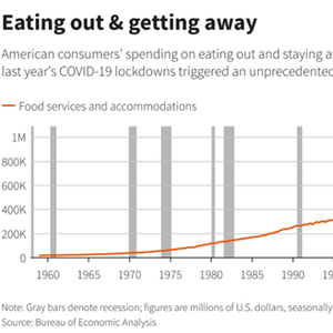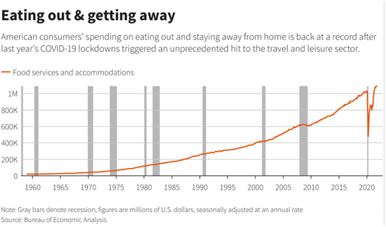 据路透社统计,2021年美国人在娱乐、外出就餐、外出度假和出国旅游上的花费恢复至疫情前,上个月更是突破了疫情前的记录。