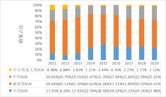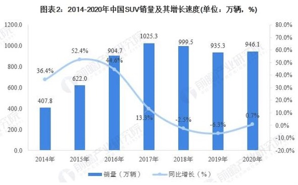 据中汽协数据统计,2014年以来,我国SUV销量占乘用车销量的比重逐年提升,从2014年的20.7%提升至2020年的46.9%, 2020年SUV年度产销规模首次超过轿车,成为我国销量排名第一的乘用车车型。
