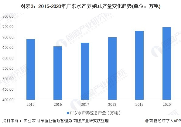 2016年以来,广东省水产养殖总产量持续回升,2020年广东省水产养殖产量746.65万吨,增幅2.4%,连续两年居全国首位。