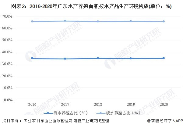 从水产养殖面积构成来看,目前广东淡水养殖面积领先于养殖面积,2016年以来,广东省海水养殖面积占总面积的比重维持在34%左右,到2020年,全省淡水养殖面积为309.38千公顷,占总面积的65.3%,海水养殖面积为164.72千公顷,占总面积的34.7%。