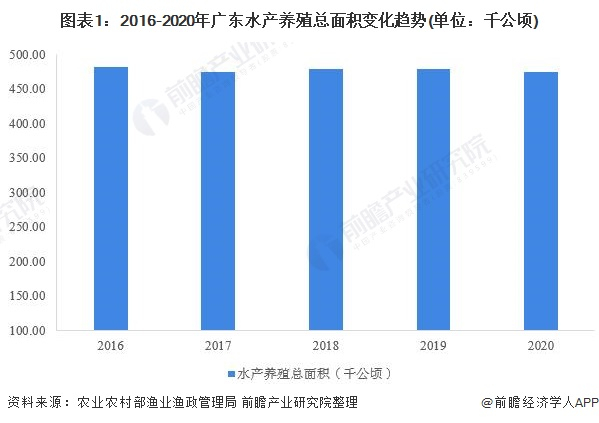据农村农业部渔业渔政管理局统计数据显示,2016年以来,广东省水产养殖面积保持在470-480千公顷之间,到2020年,广东省水产养殖面积略有下降,总面积为474.1千公顷。