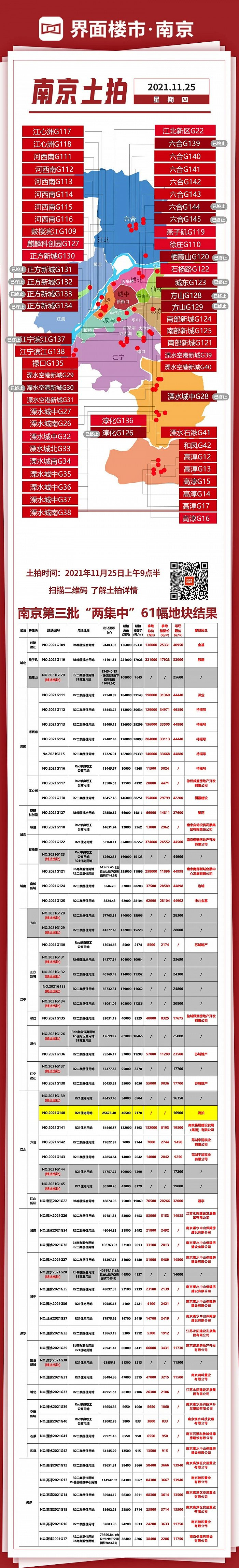 本次土拍原先预计出让61幅地块,但在11月22日,南京土地市场网公布有15幅地块因故终止出让,因此本次第三批“两集中”土拍仅剩46幅地块待出让,总出让面积约176万㎡,总出让金额约318.68亿元!