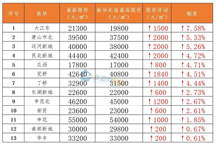 涨价最多的板块如艮北新城、运河新城与萧山市北,一把就将板块限价抬高了2000元/㎡,迈入板块进阶的征程。