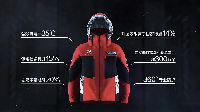 除此之外,在硬核表现上:登峰2.0还敢为人先地将航空技术材料首次用于服装领域。例如智能调温材料PCM和“3S面料”。智能调温材料通常被用于航空军工、可再生能源等领域,这可是火星祝融号的同类材料,在登峰2.0每平方米的布料就拥有超100万个可自动调节温度的储能单元——它们能够双向温度调节,高温时吸热储能,低温释热供暖,即使处于极寒和极热环境,都能维持31℃-33℃的恒温体感温度,将寒冷隔绝在外。