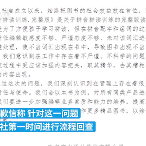 就拼音配字和组词出现不当词汇,哈尔滨出版社发布《致歉信》:对此书在全部销售渠道进行下架处理,对相关责任人进行了严肃处理和批评教育。