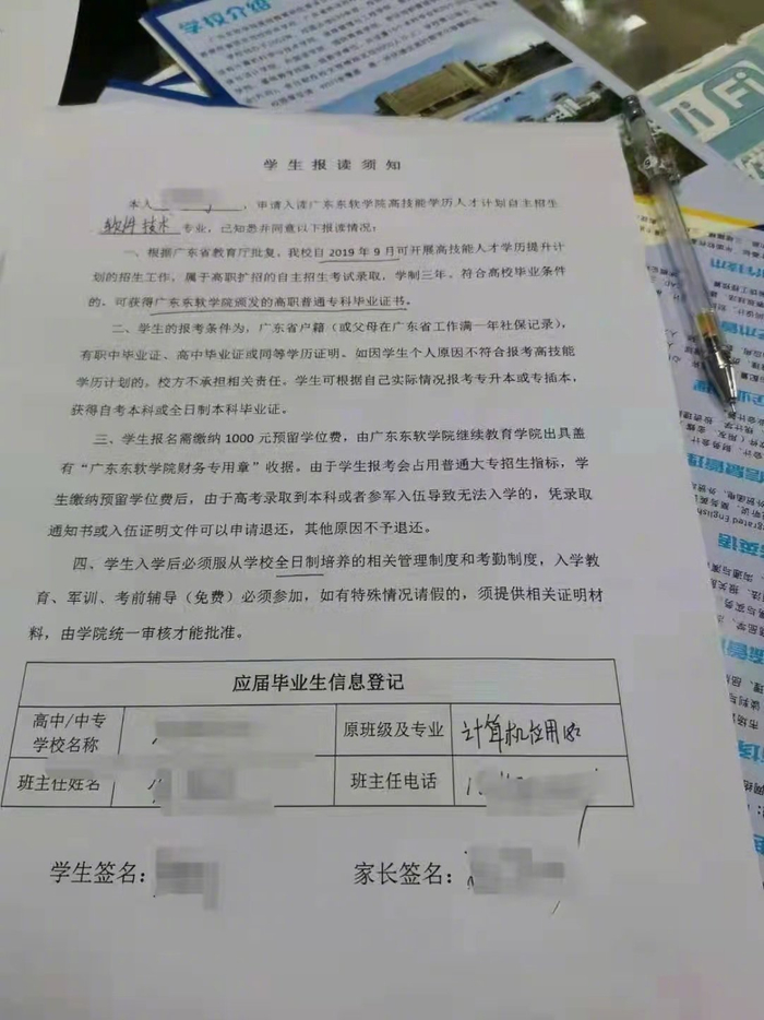 来自广东东软学院的多位学生和学生家长向央广网反映也有同样遭遇。据介绍,这些没有学籍且无法取得全日制毕业证的学生,主要来自2020级和2021级广东东软学院高职扩招的相关专业,涉事学生达数百人。在进入广东东软学院前,他们大多数正在别的中专院校就读,有的是莫名接到了广东东软学院的招生电话,有的是经人介绍后在学校招生处报了名。经向学校反复确认核实,学校均承诺通过就读该校专科或专本连读即可拿到对应全日制毕业证,并出示了毕业证样本。因此,才交了1000元名额预留费,后又按照学校规定流程办理了入学手续。此外,有学生和家长还透露,对于未取得高中或中专毕业证而需报考的学生,有学校老师称还可以帮助办理假中专毕业证或高中毕业证。