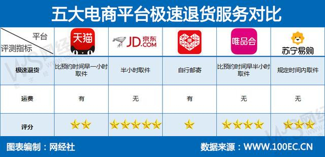 从极速退货来看,京东上门取件速度最快;天猫淘宝退货上门取件可预约时间,评测体验人员选两小时内上门取件,实际在1小时左右取走;唯品会可选择时间上门取件,实际比规定时间提早;苏宁易购也在规定时间内取走退货;拼多多没有上门取件服务。
