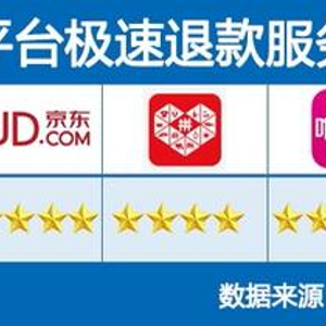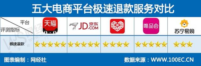 从极速退款上来看,天猫、京东、唯品会极速退款速度不相上下,拼多多极速退款相较这三家略慢,苏宁易购极速退款最慢。