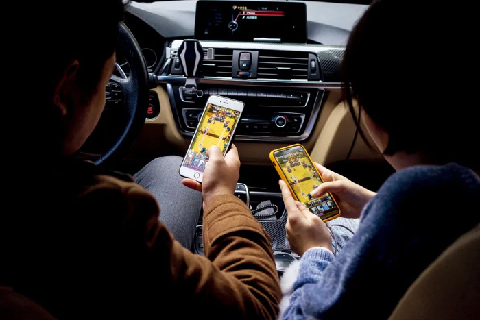 2017年6月,在停车等朋友的间隙,洛米(右)与丈夫玩起手游。90后南京女孩、电竞职业女选手洛米于2016年结束了长达7年的职业生涯,但游戏依然是生活中很重要的部分。图/视觉中国