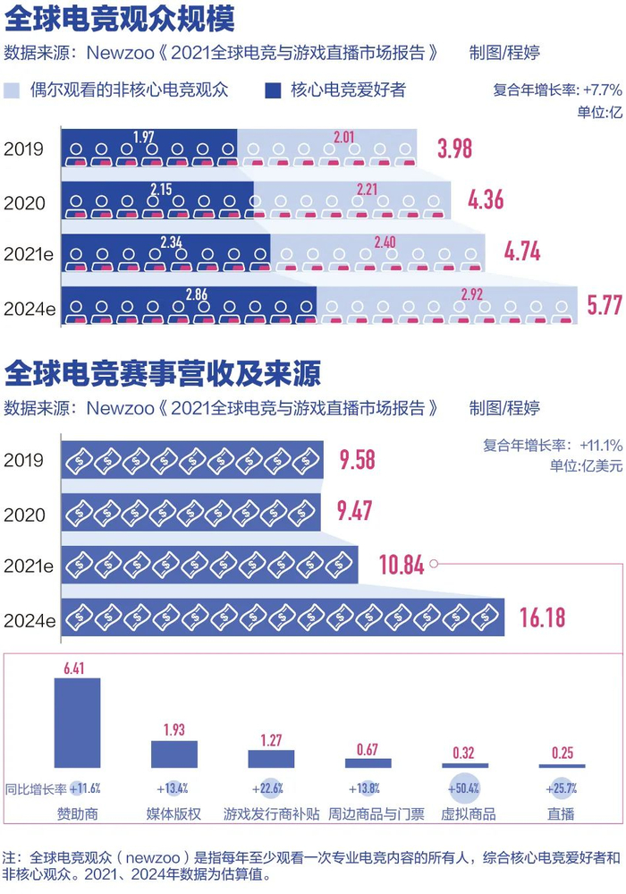 据艺恩咨询公司发布的《2021中国电竞行业趋势报告》,截至2021年3月,中国电竞用户规模已超过4.89亿。根据已有统计,足球和篮球在中国的球迷规模都只有不到2亿。尽管从宏观数据来看,电竞用户中25~30岁占比39%、20~25岁占比31%,属于绝对的核心人群,但中国互联网络信息中心的调查也明确显示,6至14岁正在成为接触游戏的主要时期。事实上,随着近年来网络的普及和手游及其衍生赛事的诞生,游戏和电竞的受众群体很难再用年龄、代际或者圈层进行简单明确的划分。
