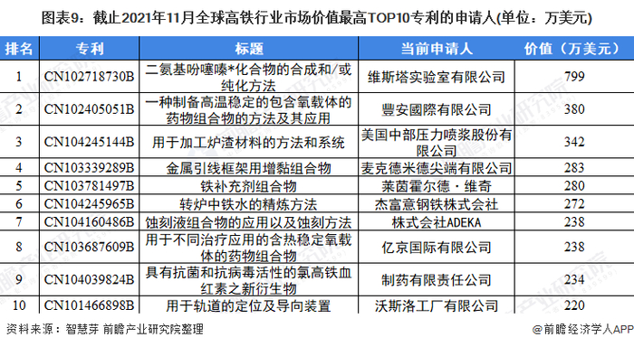 全球高铁市场价值最高TOP10专利中,排名第一的专利是二氨基吩噻嗪*化合物的合成和/或纯化方法,申请人为维斯塔实验室有限公司,市场价值达到799万美元。其余申请人信息如下: