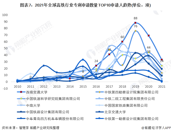 趋势方面,2010-2018年,全球前十大高铁专利申请人申请的高铁专利数差距不大,直到2018年,西南交通大学开始出类拔萃,2018年西南交通大学高铁专利申请量达到60项,并持续保持第一地位。截至2021年11月,西南交通大学高铁专利申请量达33项。其余专利申请人在2015年前后专利申请数有所增加。