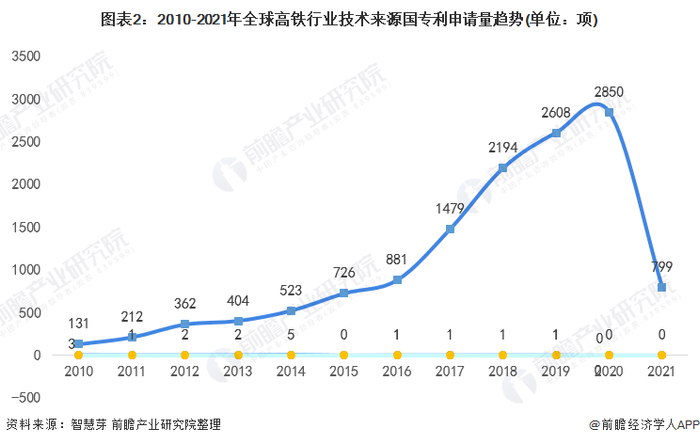 从趋势上看,2010-2020年,中国高铁专利申请数量遥遥领先。2020年,中国高铁专利申请量为2850项,日本、美国和韩国均未申请高铁专利。