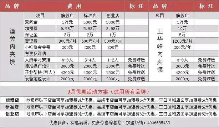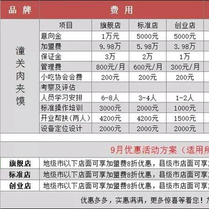 值得注意的是,潼关肉夹馍协会在密集维权的同时,还授权西安万盛餐饮管理有限公司与潼关县盛潼餐饮管理有限公司关于“潼关肉夹馍”商标的使用权、运营权以及商标品牌宣传、推广权,并通过收取费用,对商户进行加盟授权。据该协会微信公众号发布的加盟方案介绍,以旗舰店为例,意向金、保证金、加盟费的标价总和高达13.98万元。