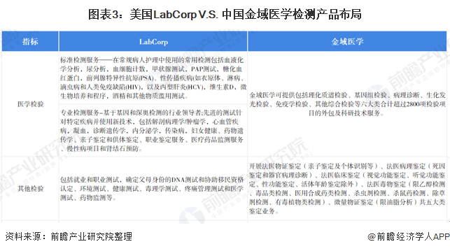 在检测产品布局上,美国LabCorp提供包括标准检测服务、专业检测服务在内的超过5000项医学检验;金域医学提供涵盖理化质谱检验、基因组检验、病理诊断、生化发光检验、免疫学检验、其他综合检验超过2800项医学检验项目。
