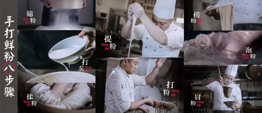 手打鲜粉共8个步骤:筛粉、打芡、揉粉、提粉、打粉、泡粉、捞粉、冒粉,每个步骤均标准化和数据化。