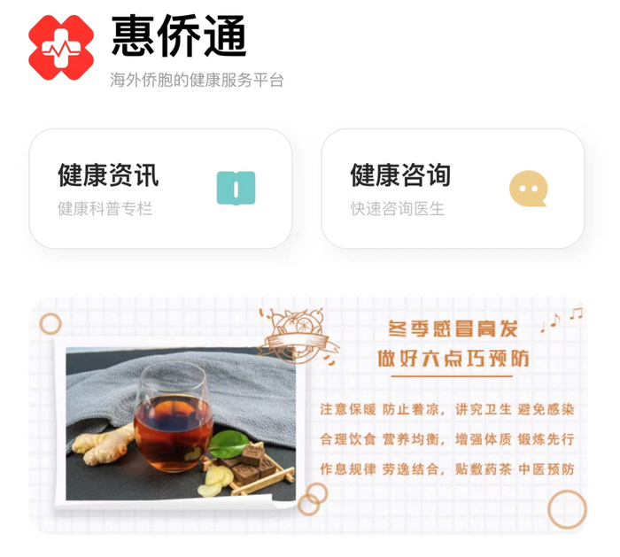 据悉,“惠侨通”健康服务平台提供智能健康、健康科普、线上活动、弘扬中医药文化等服务。平台实现智能化疾病问诊,侨胞提出健康疑问,由AI精准识别并分配相关领域医疗专家进行解答。侨胞们关注公众号即可进入该平台咨询,获取健康科普咨询等。