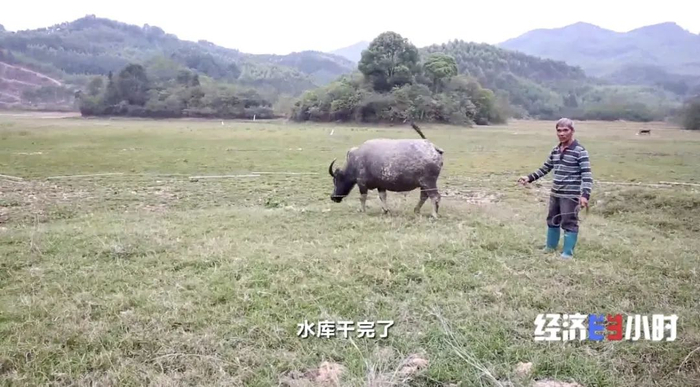 广西柳城县东泉镇莫道村,11月初的时候,村子附近的保门水库已经成了村民们的放牛场。