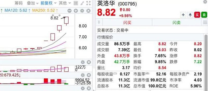 今日开盘后11分钟,英洛华强势封住涨停板。截至今日午间收盘,英洛华已连续实现四个涨停,最新股价为8.82元,股价创两年来新高,总市值约为100亿元。