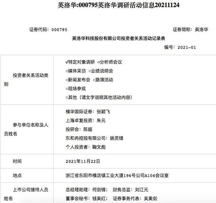 英洛华11月24日发布的投资者关系活动记录表显示,公司于2021年11月22日接受了调研。
