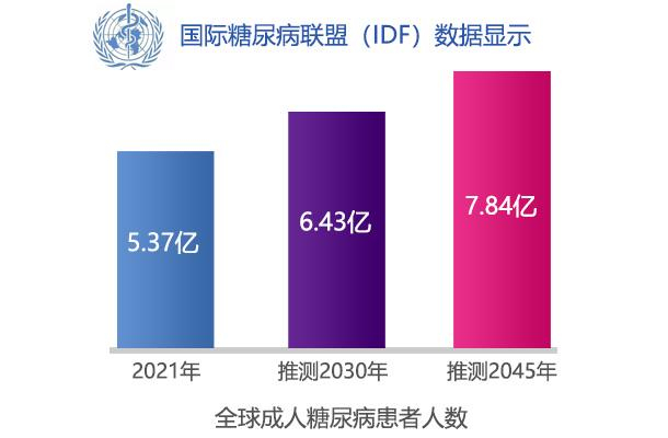 糖尿病是21世纪发展最快的健康问题之一。国际糖尿病联盟(IDF)数据显示,2021年全球成人糖尿病患者人数已达5.37亿人,预计至2030年将增至6.43亿人,至2045年达7.84亿人。2019年,IDF推算我国成人糖尿病患者人数约为1.16亿,位列世界第一。