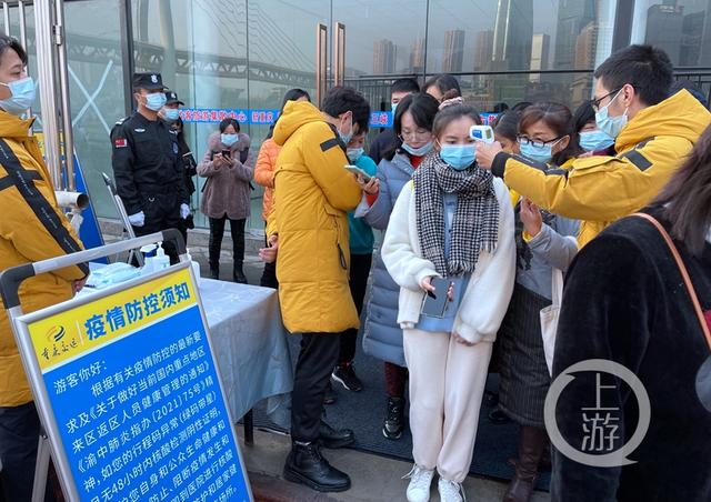 从观景台顺阶而下,经过体温检测、查验渝康码和行程码后,就能进入整洁美观的码头游客集散平台。一码头、二码头、三码头的趸船在江边一字排开,分别停靠着轮渡船和两江游船。为方便游客登船,趸船上的LED屏滚动播放着各航线的航班信息、防疫注意事项和安全须知,现场的游客也在工作人员的引导下遵守一米线的规定依次排队购票。
