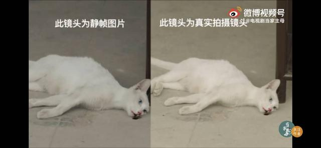 剧组提供说明的视频将在小猫倒地后,继续舔食嘴边的“血浆”的场景,与剧中截取的、小猫安静躺地的静帧画面进行了对比。但也正是这一部分,引起了更大的争议。一位名为@-Flotus-的博主发布了自己家里的猫舔舐嘴唇和官方微博中小猫舔舐嘴唇的动作,网友们质疑官方视频中小猫舔舐嘴唇的动作是后期加上的,当时的小猫并没有该动作。