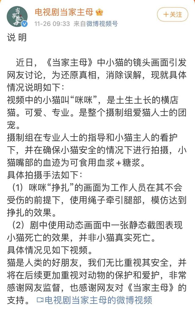 该事件在网络发酵后,《当家主母》官方微博于11月26日早晨发布了一条微博,称戏中的画面“并非小猫真实死亡”,并对该情况进行了解释说明。官方微博的解释中称,视频中的小猫叫“咪咪”,是土生土长的横店猫。该场景是在专业人士的指导和小猫主任的看护下进行拍摄,小猫嘴部的血迹是可食用血浆和糖浆。而对于网友提到的小猫“挣扎”的表现,和躺在地上的静止画面,则分别是通过工作人员“使用绳子牵引腿部,模仿达到挣扎的效果”和截取静态截图的效果。