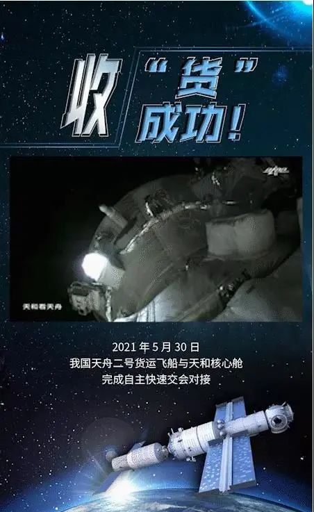 天舟二号的快速交互对接系统已经提前安排好入轨后的动作时序,节省了指令在天地间传达的时间,也免去地面临时注入程序的流程,从地面“发货”到“快递小哥”来敲门的时间大约8个小时,堪比“同城快递”,实现了空间站任务物资运输快速补给。