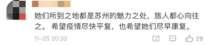 更有细心的网友发现她们是江南文化的“真爱粉”, 从园林、古建到博物馆,所去之处简直是一场深度的“苏州文化之旅”。对此,苏州博物馆、吴文化博物馆等多家单位也留言表示:“愿朋友们都好,待一切过去,我们再约文化之旅”。