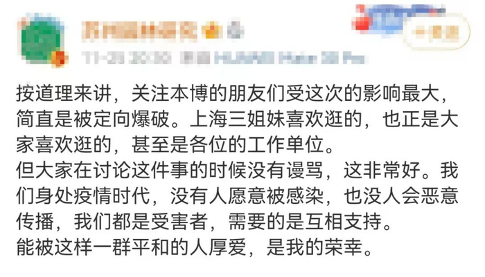确诊病例的行程曝光后,很快在社交媒体上引发了热烈讨论。而与此前不同的是,众多网友并没有表现出过度的迁怒和谩骂,不少人送上了暖心的祝福,希望三位女性能早日康复,疫情尽快平复。