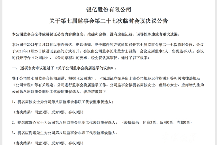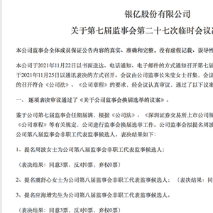 公告显示,银亿股份第七届董事会任期届满,于2021年11月25日,银亿股份以通讯表决的方式召开第七届董事会第六十七次临时会议,会议审议通过了《关于公司董事会换届选举的议案》。