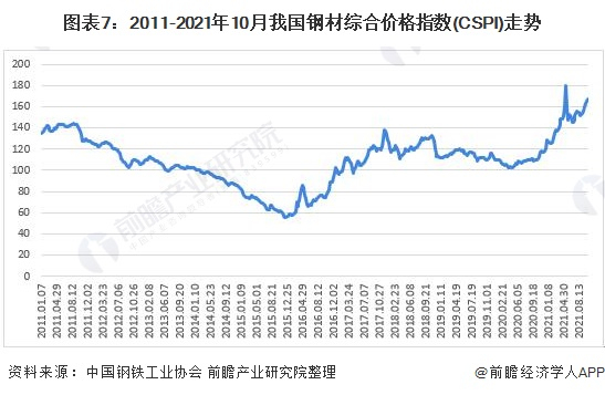 根据中国钢铁工业协会数据,2011-2021年10月,我国钢材综合价格指数呈现下降后波动上升的趋势。其中2011-2015年我国钢材综合价格指数连续下降;2016年,我国钢材价格持续上升;2017年,受钢铁去产能工作深入推进、“地条钢”全面取缔、采暖季错峰生产和市场需求回升等因素影响,钢材价格大幅上涨;2018-2020年7月,钢材价格稍有回落。这主要是由于下游市场需求下降,导致钢材价格下行。2021年5月,钢材综合价格指数达到近十年来峰值,为174.81,此后有所回落。