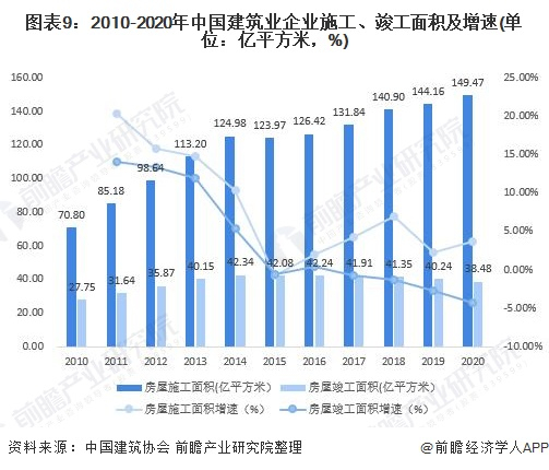 2020年,全国建筑业企业房屋施工面积149.47亿平方米,比2019年同比增长3.68%,增速比2019年提高了1.36个百分点;竣工面积38.48亿平方米,连续四年下降,比2019年下降4.37%。