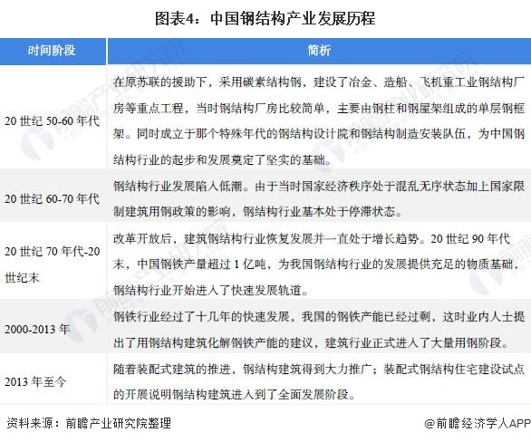 钢结构产业在我国的发展可追溯到20世纪50-60年代,在原苏联的援助下,采用碳素结构钢,建设了冶金、造船、飞机重工业钢结构厂房等重点工程,为中国钢结构行业的起步和发展奠定了坚实的基础。改革开放后,建筑钢结构行业恢复发展并一直处于上升趋势。2013年至今,随着装配式建筑的推进,钢结构迎来发展新契机。
